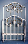 | When shopping for an antique iron bed it's important not to make your choice based on the existing finish. Most frames have been painted over many times and usually with lead-based paints. Cleaning and sealing an existing finish can be acceptable for adults who are aware of that fact. For children, however, we recommend that we sandblast the old paint off and refinish with safe paint in colors that work with your decor. |