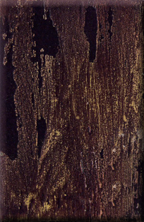 Heavily distressed rusty brown with touches of gold on a black base.